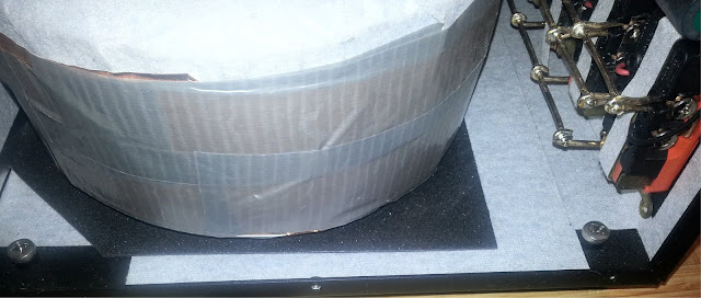 Fascinated by the size of the huge toroid transformer, I initially overlooked something: the prolific use of the Stillpoints ERS stealth cloth lining the chassis and most of the components. I knew how much a 20-amp 120V low-leakage isolation transformer costs so I was initially impressed by its appearance inside of this unit, so much so that I initially ignored the gray cloth. With this cloth appearing almost everywhere, it gave the unit a really "clean" appearance matching the class engraved front panel.