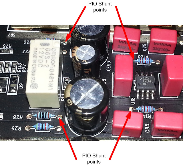 Others have used shunt capacitors from the underside of the PC board but the PIO capacitors I chose are quite large (about 3/4" in diameter) and will not fit. The task was to figure out where to add wires to the ends of the readily-accessible resistor leads to accomplish the same results as soldering them to the underside. Note from the above schematic that R128/R140 connect to one end of this capacitor. Resistors R23/R28 (or R25/R20) connect to the other end. Below is a highly magnified view of the output stage showing where these resistors are located from the top of the PC board. The red arrows show which resistor ends are used and the rear of the chassis is on the left.